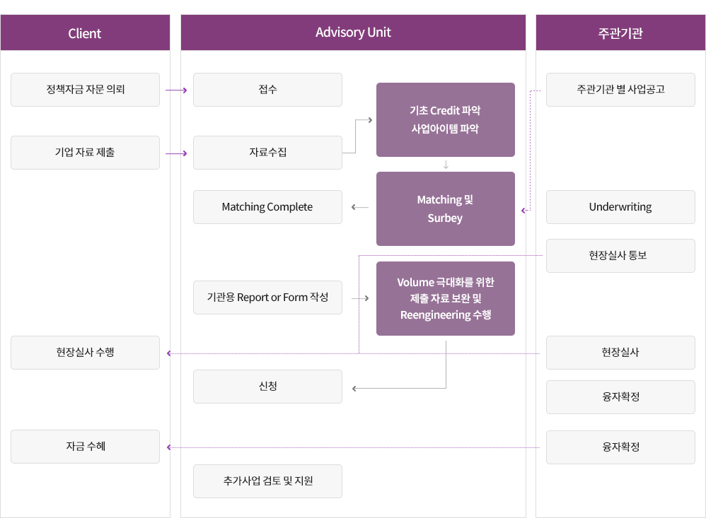 따라서, 기업의 자금 수요 규모와 시기, 조건에 따라 자금 수혜의 가능성은 큰 차이를 보입니다. 전문 컨설턴트의 자문서비스는 기업의 수요에 맞는